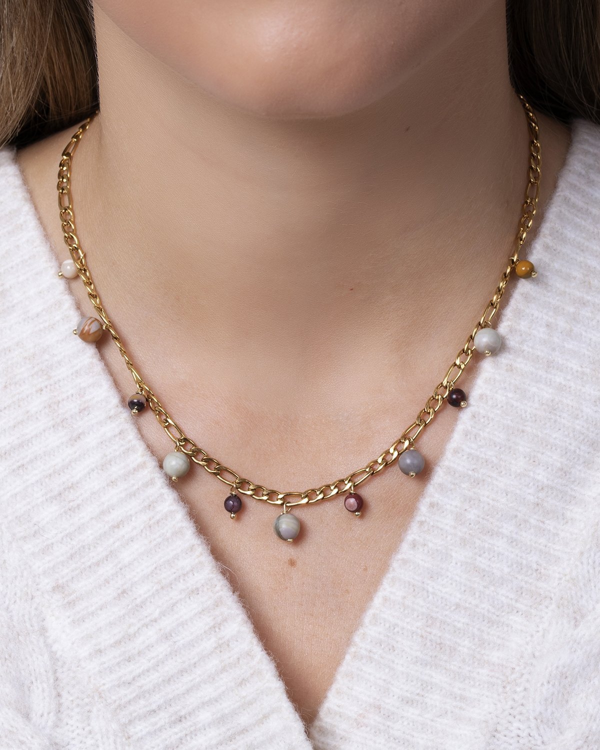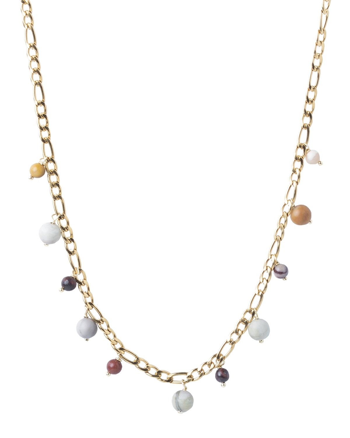 El collar Figaro Fall está hecho en acero inoxidable chapado en oro de 18 kilates y combina una cadena figaro clásica con pequeños colgantes de piedras naturales. Este diseño único lo convierte en un accesorio versátil y lleno de personalidad, perfecto para cualquier ocasión.