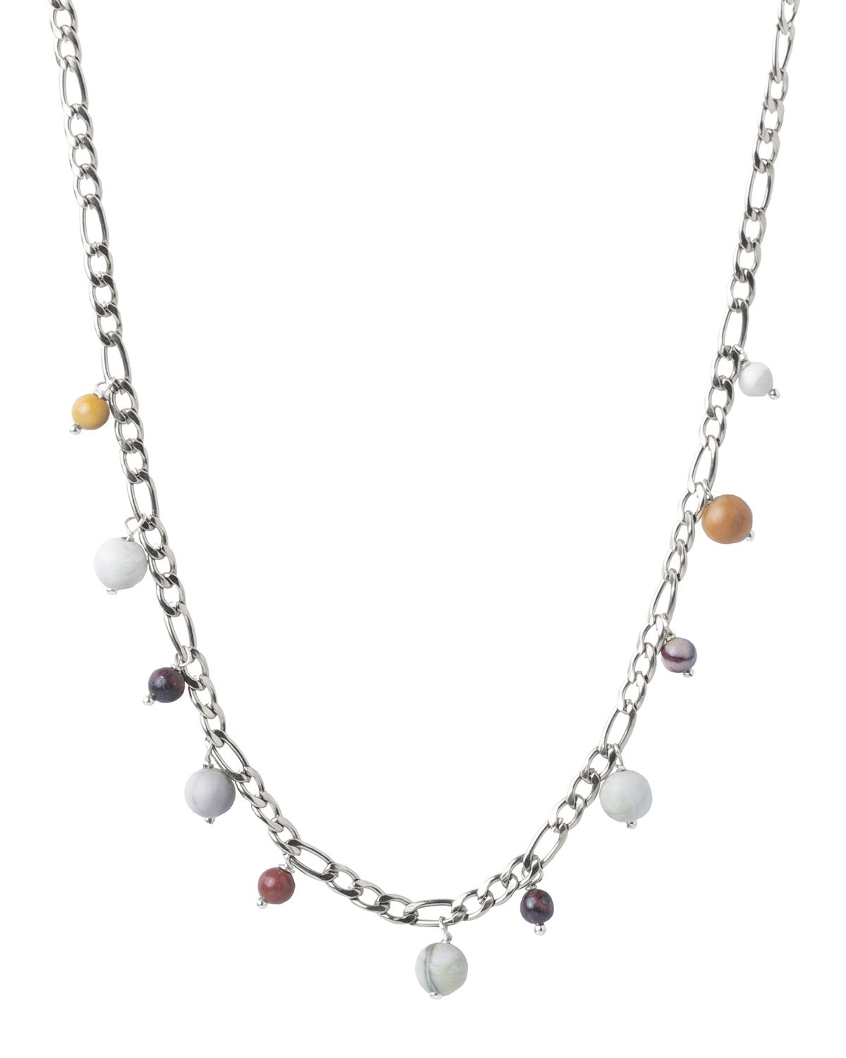 El collar Figaro Fall está hecho en acero inoxidable y combina una cadena figaro clásica con pequeños colgantes de piedras naturales. Este diseño único lo convierte en un accesorio versátil y lleno de personalidad, perfecto para cualquier ocasión.