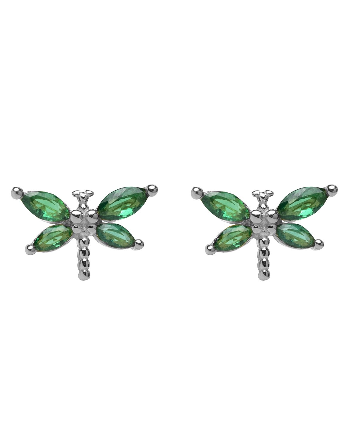 Pendientes estilo piercing en forma de libélula con zirconitas de color esmeralda en talla marquesa y cierre a rosca trasero hecho en plata de ley 925.