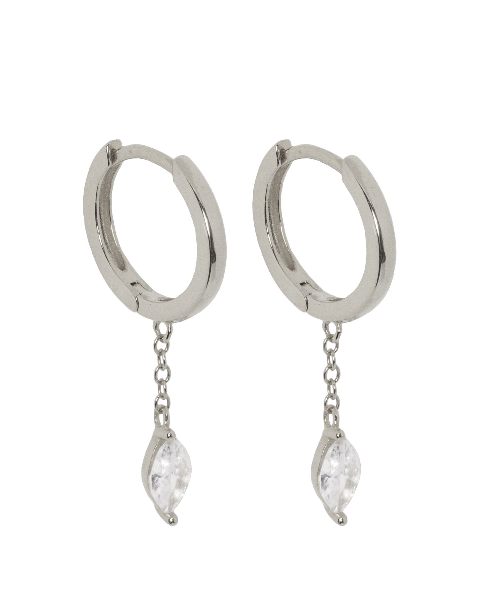 Pendientes de aro hechos en plata de ley 925 con una cadena y un colgante con una zirconita en talla marquesa. Llévalos solos o combínalos con otros pendientes.