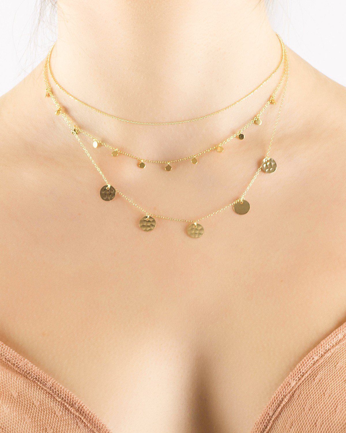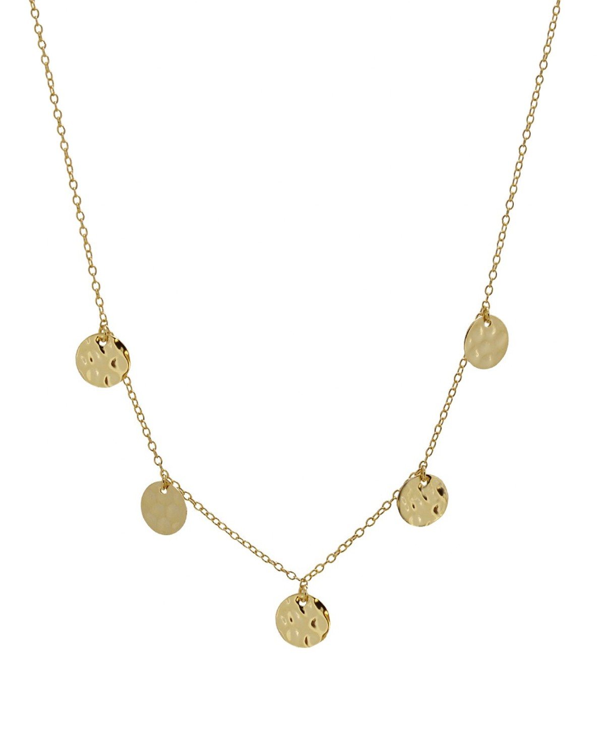 Este collar de diseño contemporáneo luce 5 charms circulares con textura colgando en el centro de una cadena de plata de ley 925 chapada en oro de 18 kilates. Su longitud ajustable (38-43 cm) y estilo versátil lo hacen perfecto para uso diario o para combinar con otras piezas.