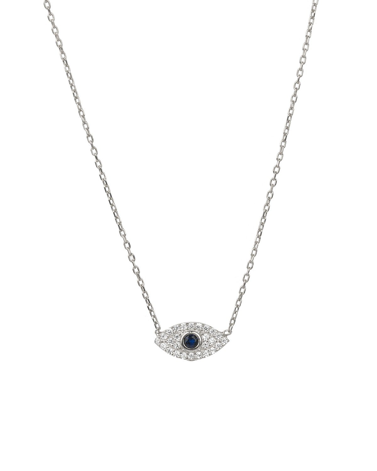 Este collar presenta un colgante en forma de ojo de la suerte (13x6 mm) elaborado en plata de ley 925, adornado con zirconitas brillantes y una zirconita azul zafiro en el centro. Una pieza cargada de simbolismo y elegancia.