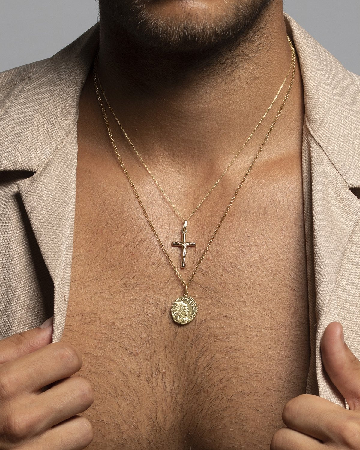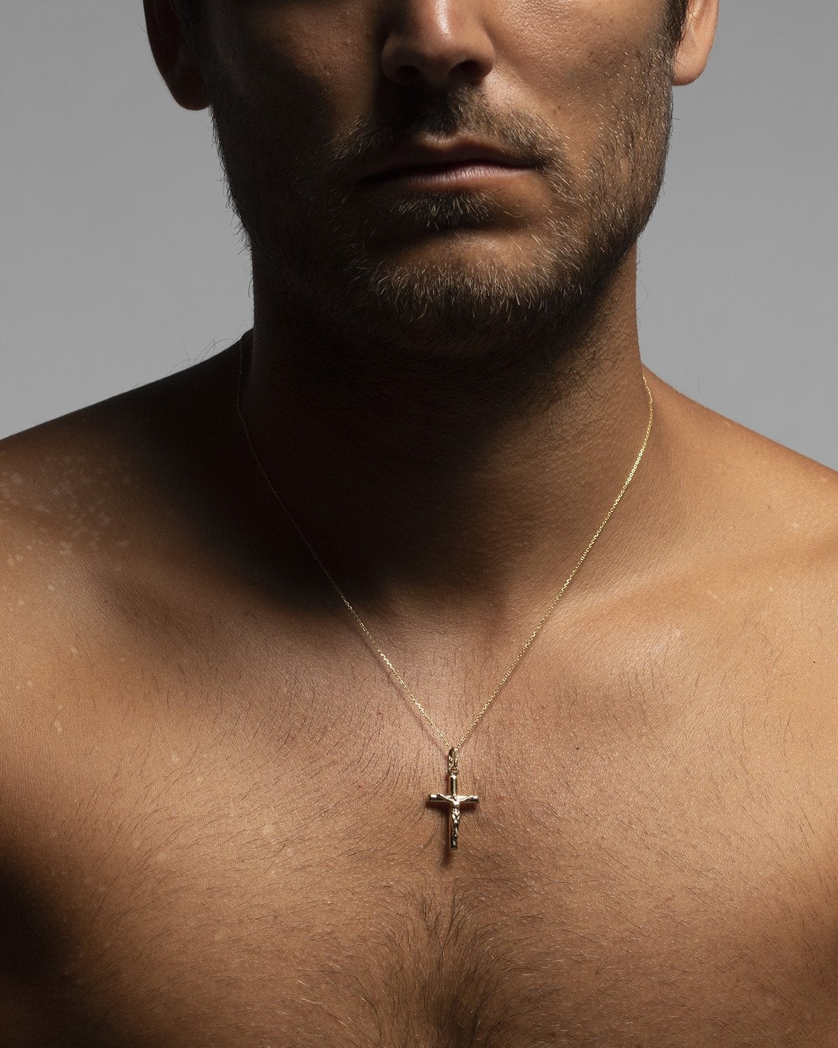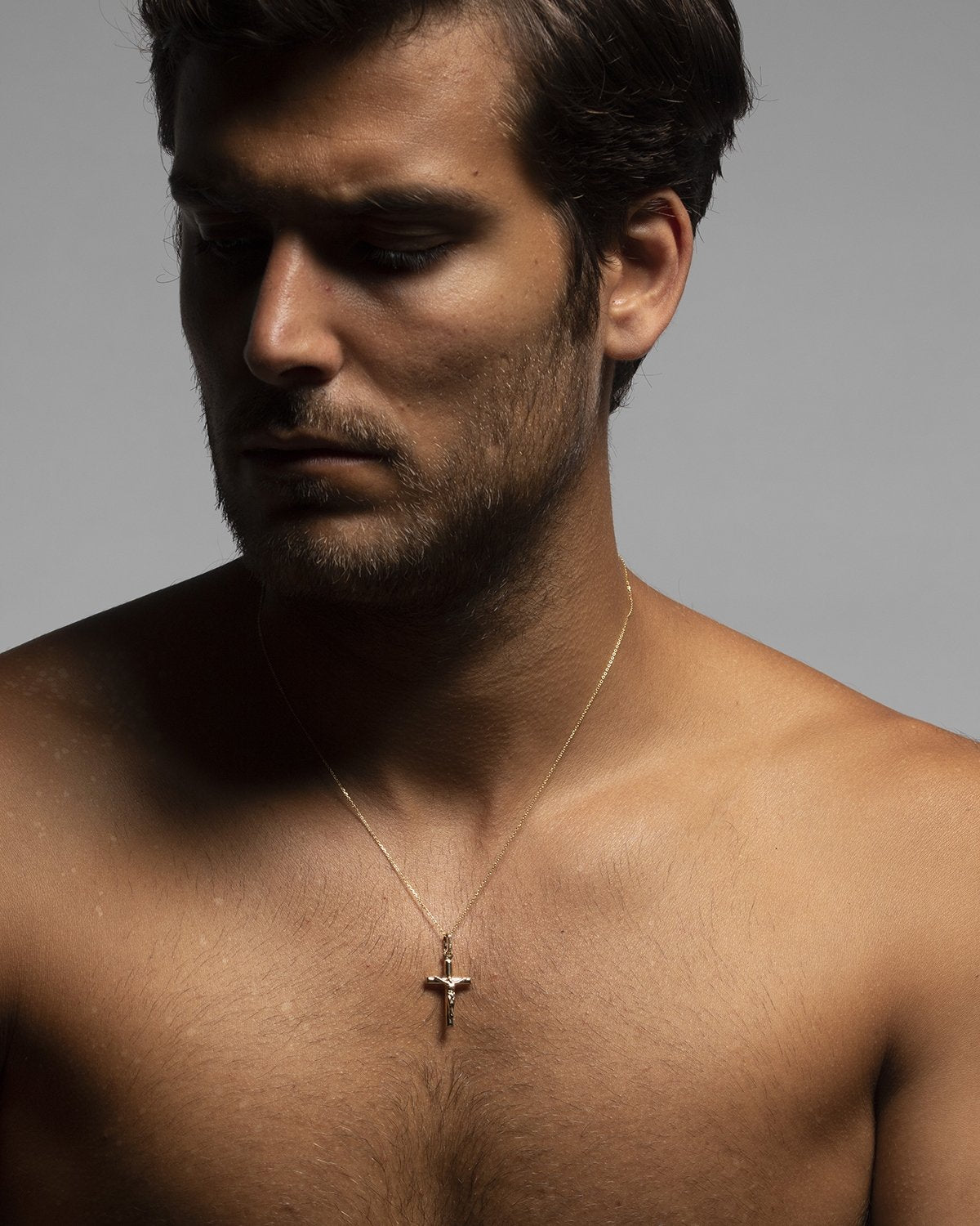 Este collar de plata de ley 925 chapada en oro de 18 kilates presenta un colgante de cruz con Cristo en relieve (25x32 mm), un detalle artesanal que combina tradición y estilo. La cadena de 50 cm ofrece un largo versátil, ideal para llevar sobre camisas o prendas casuales, perfecto para hombres que valoran piezas con significado.