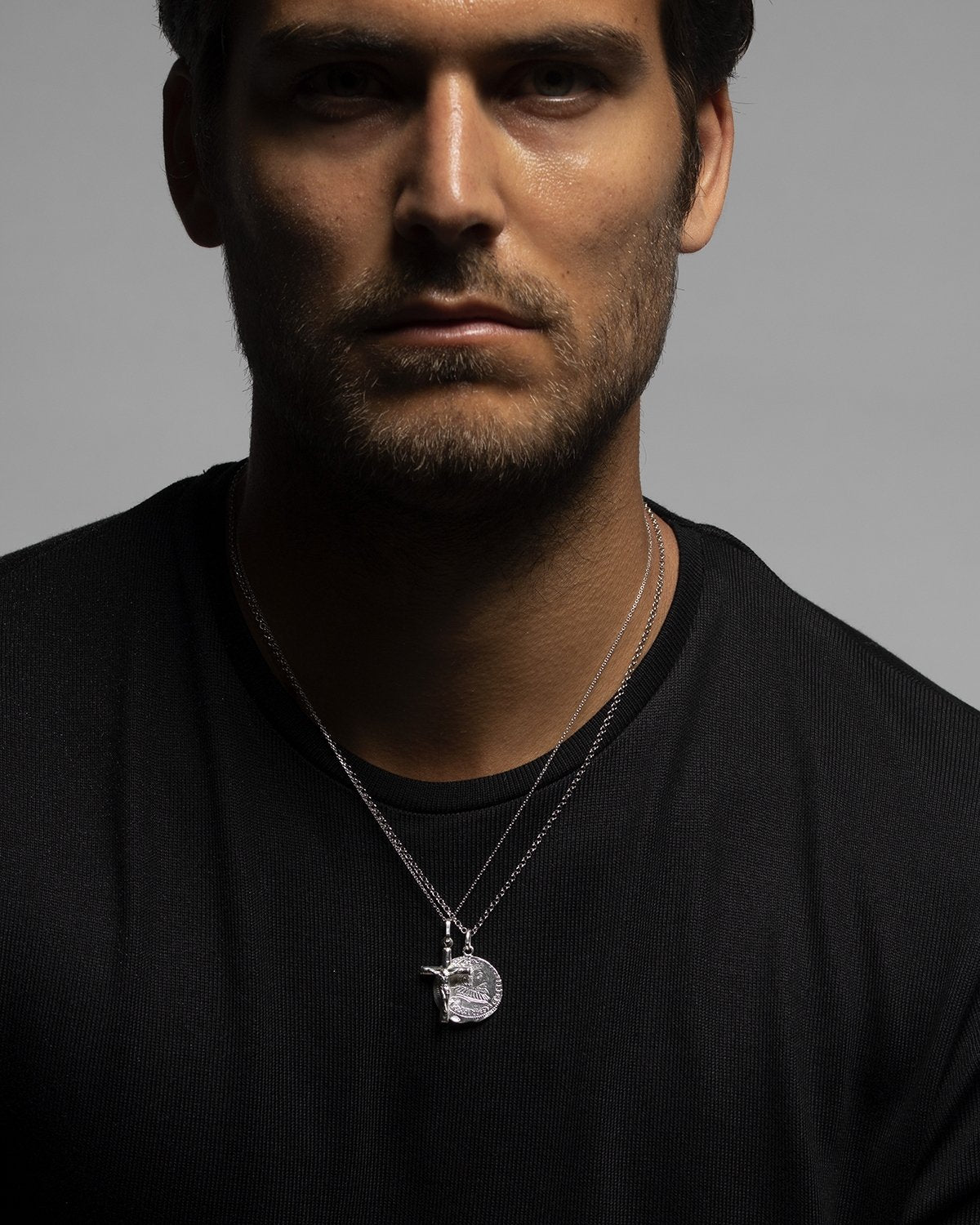 Este collar de plata de ley 925 presenta un colgante de cruz con Cristo en relieve (25x32 mm), un detalle artesanal que combina tradición y estilo. La cadena de 50 cm ofrece un largo versátil, ideal para llevar sobre camisas o prendas casuales, perfecto para hombres que valoran piezas con significado.