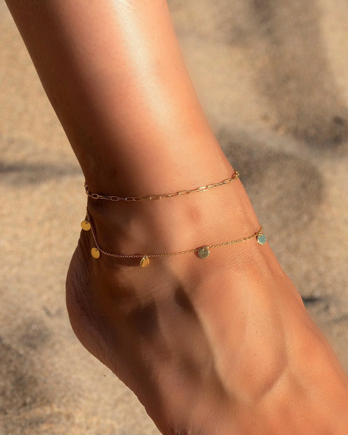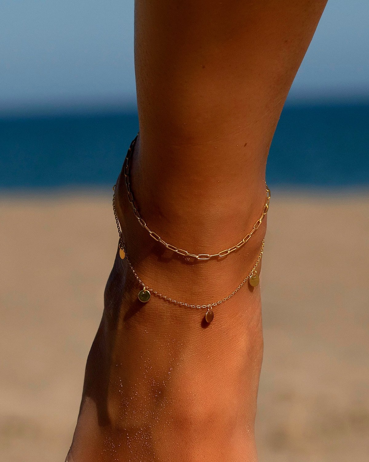 Esta tobillera de cadena paperclip en plata de ley 925 chapada en oro de 18 kilates combina un diseño contemporáneo con la funcionalidad de un ajuste perfecto. Con su longitud ajustable de 21 a 26 cm, se adapta cómodamente a cualquier tobillo, ideal para uso diario gracias a su ligereza y cualidades hipoalergénicas.