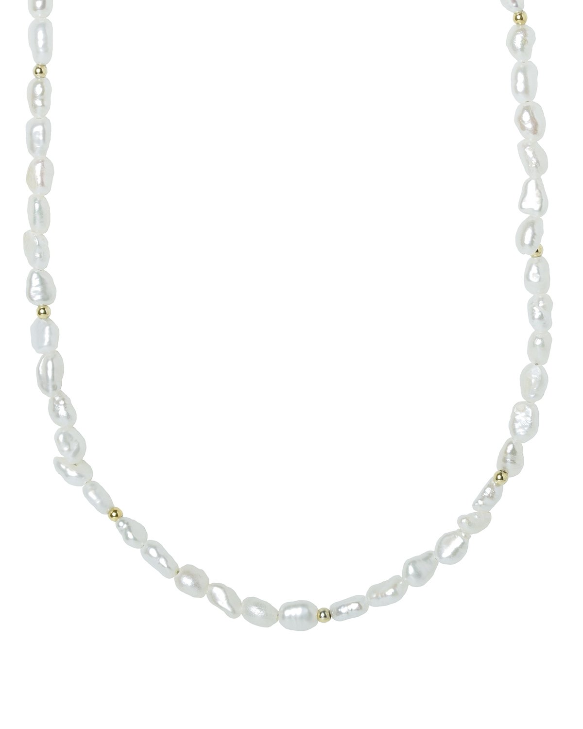 Este collar estilo gargantilla está hecho en plata de ley 925 chapada en oro de 18 kilates y combina perlas naturales en forma de granos de arroz con pequeñas bolas de oro, creando un diseño elegante y versátil. Su largo ajustable lo convierte en una pieza perfecta para cualquier ocasión.