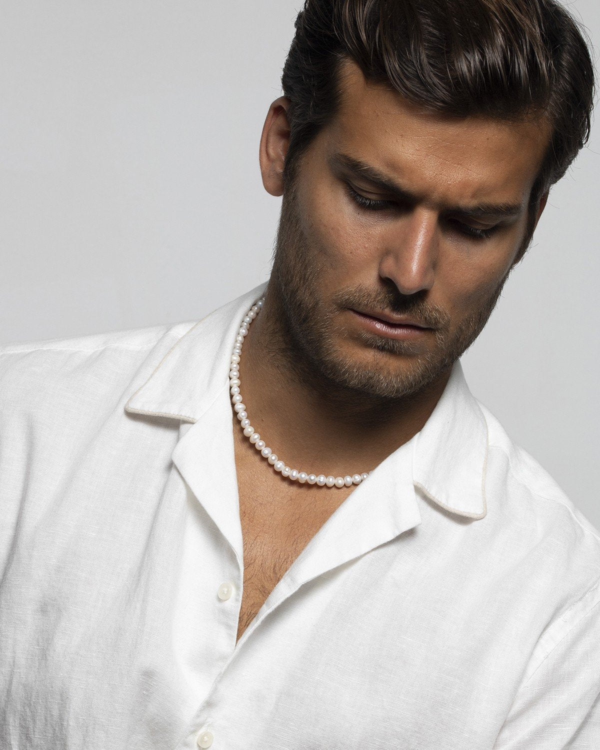 Este collar combina la sofisticación de perlas cultivadas con la calidez de cierres y cadena en plata 925 chapada en oro 18K, creando una pieza versátil que rompe estereotipos. Una apuesta audaz para hombres que buscan actualizar su estilo con joyería refinada pero masculina.
