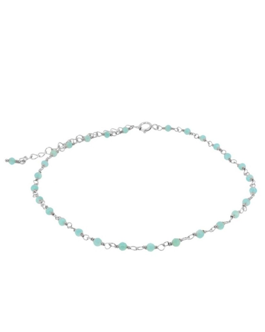 Esta tobillera combina una cadena de rosario con minerales naturales de amazonita, engastados en plata de ley 925. Con un tamaño ajustable (21 cm + 5 cm de extensión), es ideal para looks relajados de verano o para añadir un toque especial a tu estilo diario.