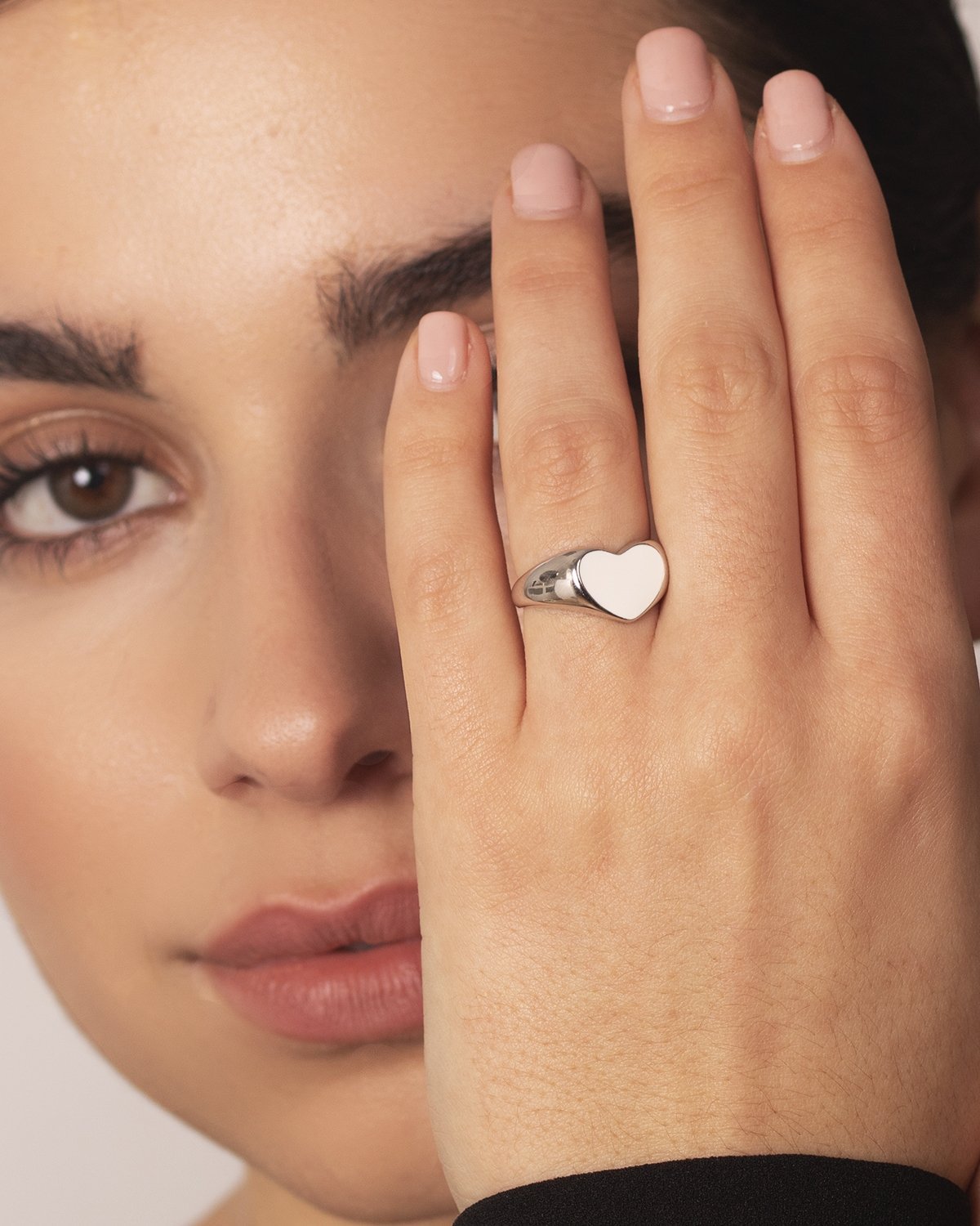 Este anillo estilo sello tiene un diseño en forma de corazón con un esmaltado blanco brillante. Hecho en plata de ley 925, es una pieza elegante y moderna, perfecta para añadir un toque romántico a tu colección de joyas.